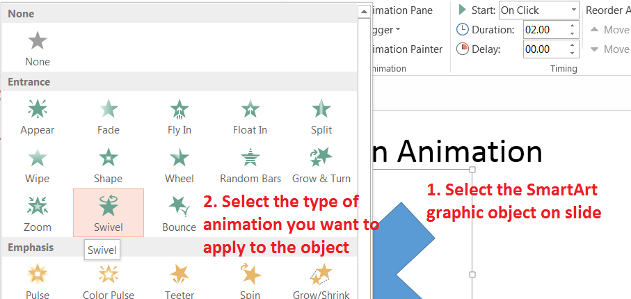 Let's start with a simple animation example - SmartArt graphics. To provide additional emphasis or show your information in phases, you can add an animation to your SmartArt graphic or to an individual shape in your SmartArt graphic. For example, you can make a shape fly in quickly from one side of your screen, or slowly fade in, or turn in circles if that's what the project you are working on is currently doing! Simply add the desired SmartArt to your slide and then select one of the animation functions from the Animation menu.