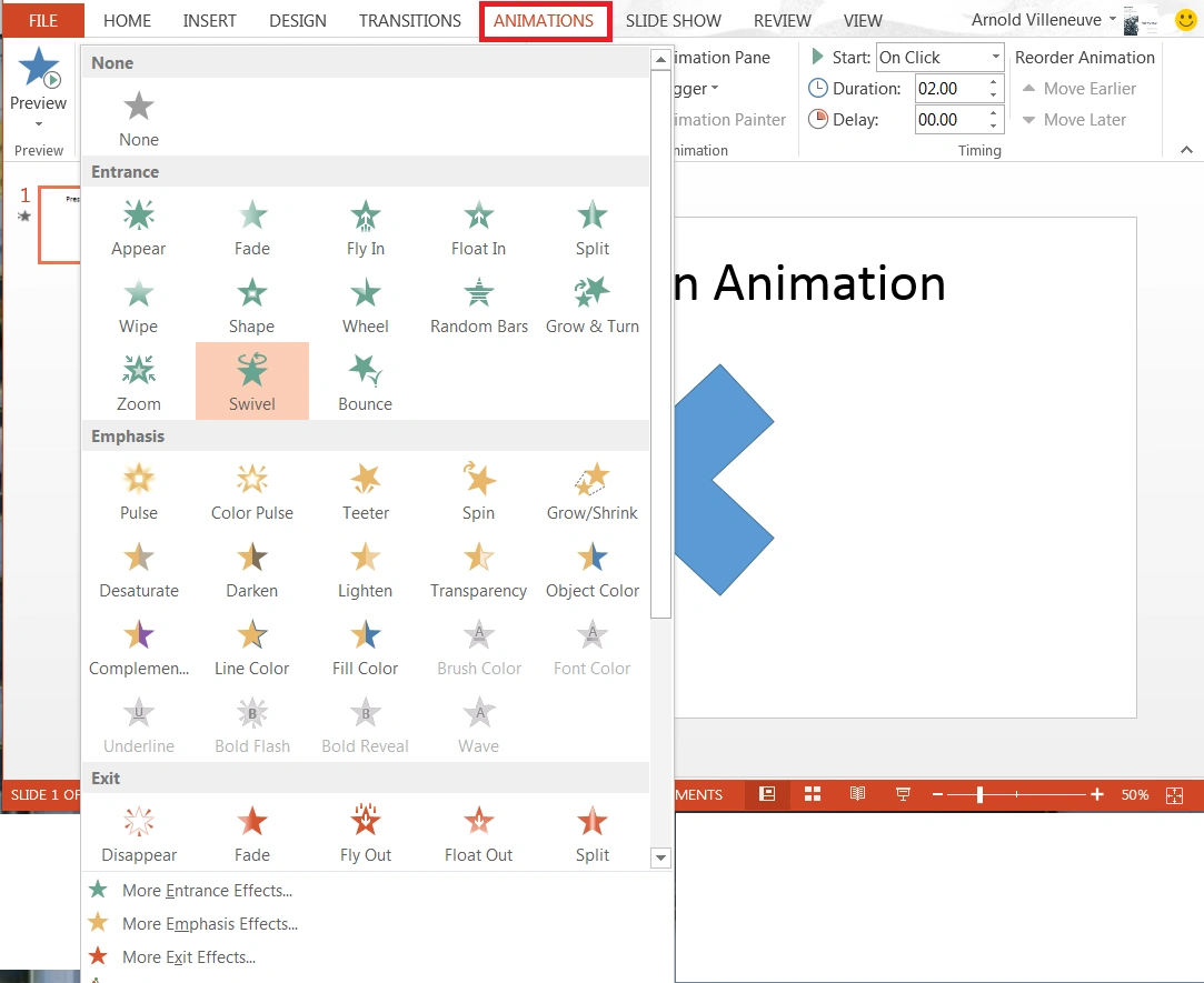 You access the Animation features from the Animation tab at the top of the PowerPoint ribbon which will then change to highlight the animation options.